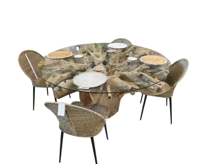 Tables à manger indonésiennes, invitant au partage des repas dans l’atmosphère chaleureuse et authentique de Bali.
